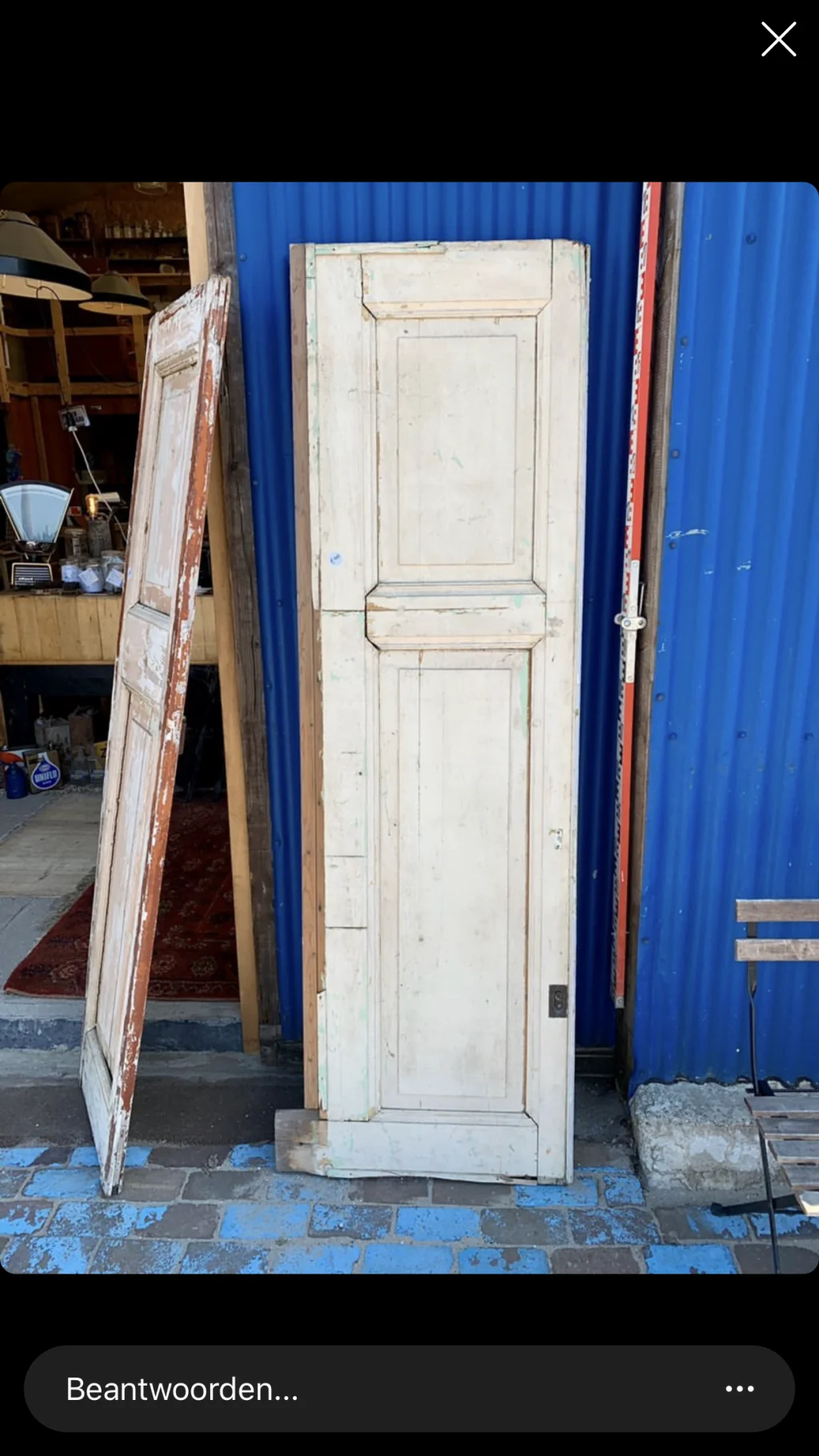 We hebben er ook een oude deur gezien. We wilden eigenlijk de linker deur, maar die was al gereserveerd. ’s Avonds stuur ik een berichtje over de rechterdeur. Ik kan er wel wat mee en wil deze graag tegen de schutting bevestigen naast het blauwe luik. Ik ga hier wat tofs van maken. We maken een afspraak en deze te gekke deur wordt morgen (maandag) bezorgd.