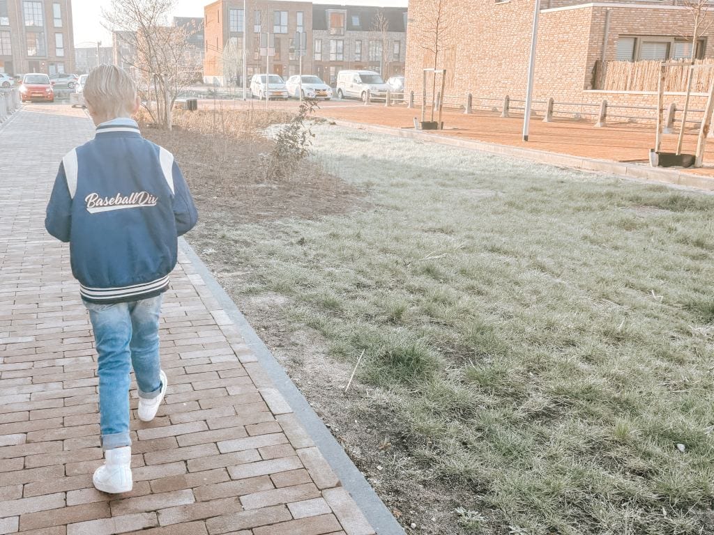 - In zijn nieuwe outfit naar school.
