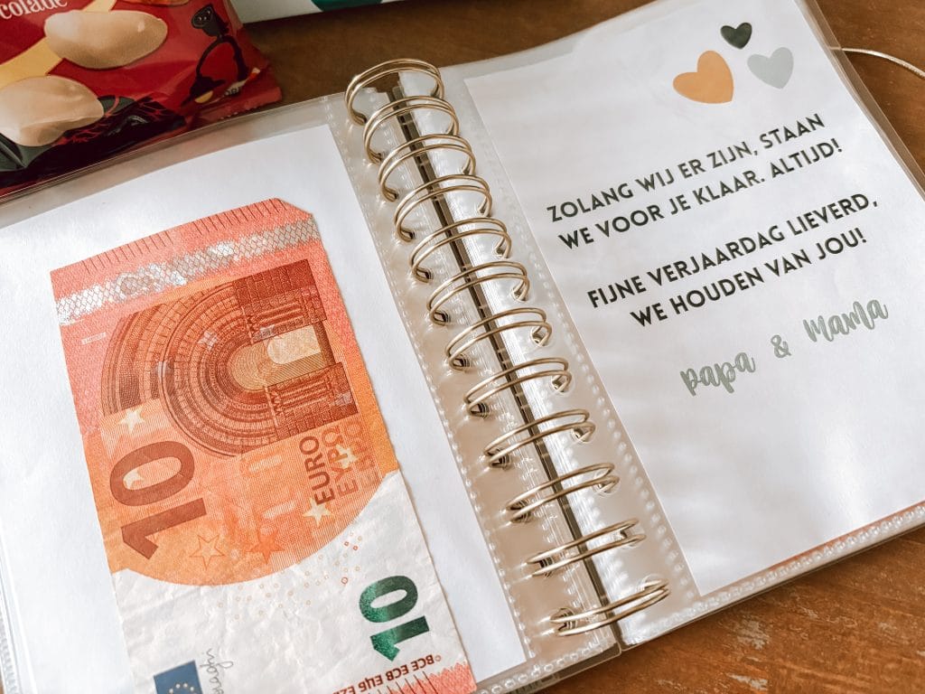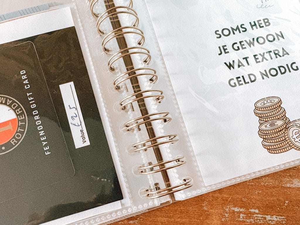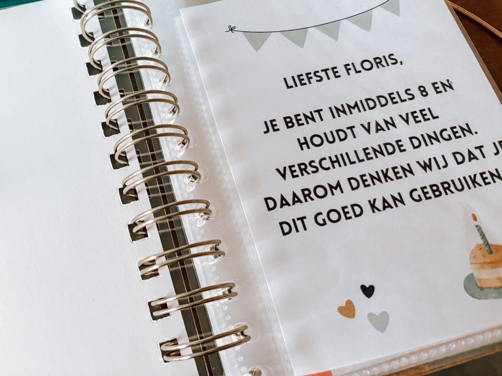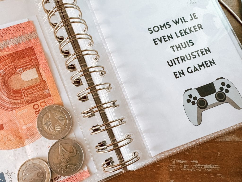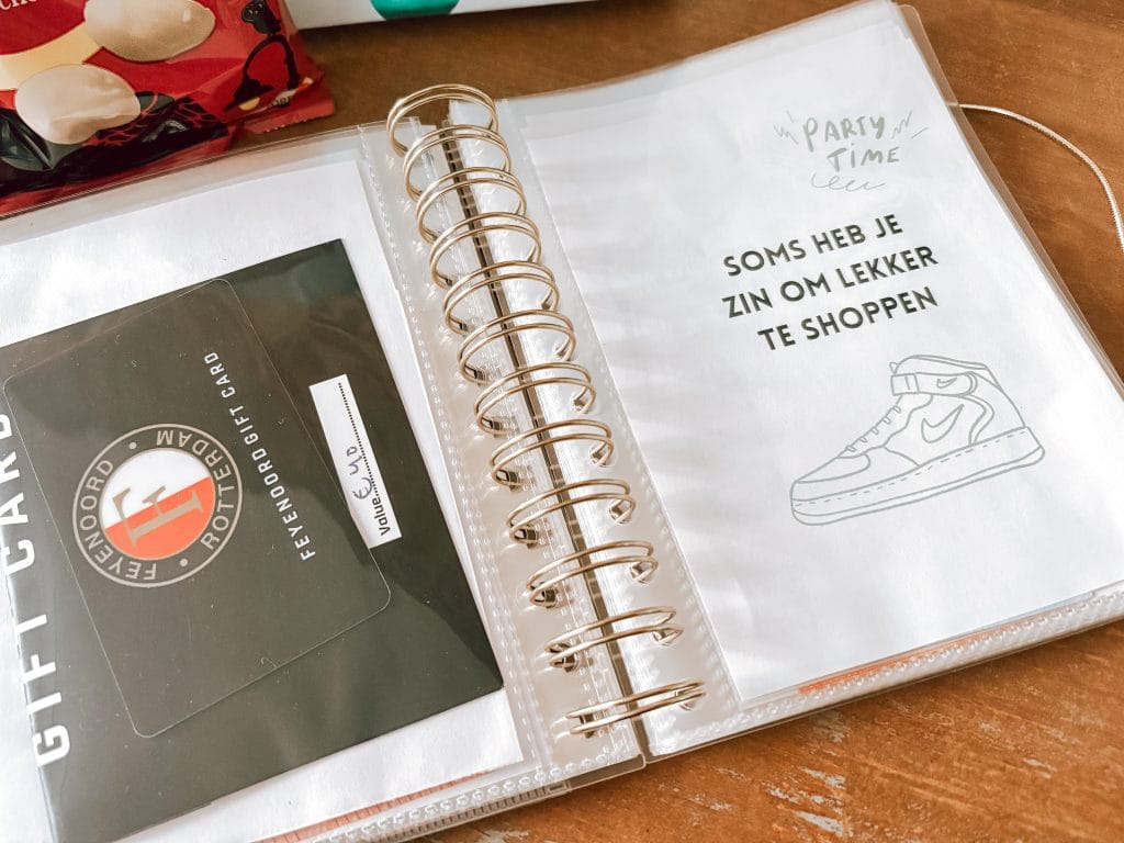 Een bonnenboekje is eigenlijk een digitale download met daarin allemaal leuke pagina’s waar je zelf bonnen of geld aan toe kan voegen. Ins ons geval kozen we voor een bonnenboekje voor jongens. Deze zijn niet op naam, maar kun je – als je dat wil – heel eenvoudig aanpassen in Canva. Zo hebben wij deze aangepast met naam en bonnen gemaakt die passen bij de interesses van de jongens. Vervolgens print je alle bonnen uit en stop je deze in een fotomapje. Ik kocht het fotomapje bij de HEMA, maar Action heeft ze ook. Voor de kaft van het boekje kochten we een leuke kaart.
